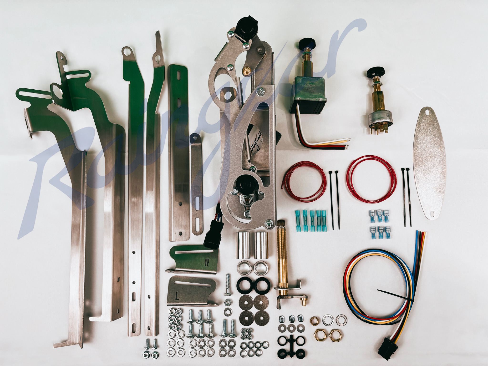 The kit comes complete less assembly lube, arms and blades, escutcheons and model-specific knobs for the switch. All those stock pieces will fit on our system. Escutcheons are the exterior trim bezels which cover the pivot posts in the cowl and are available separately, see below.